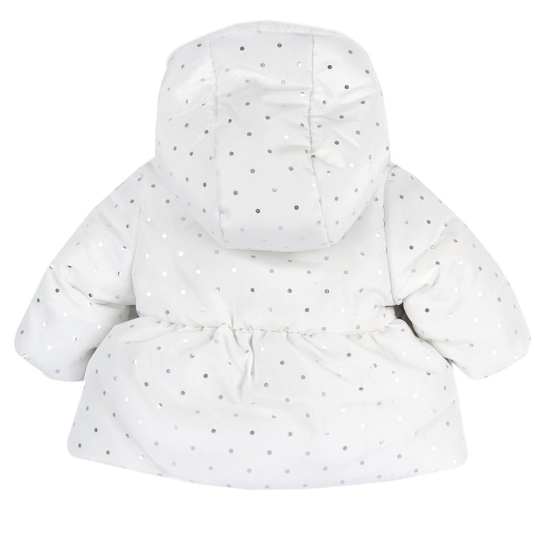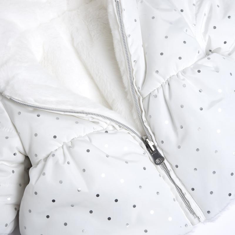 Βρεφικό γουνάκι για κορίτσι με κουκούλα, διπλής όψης λευκό με πουά σχέδιο.