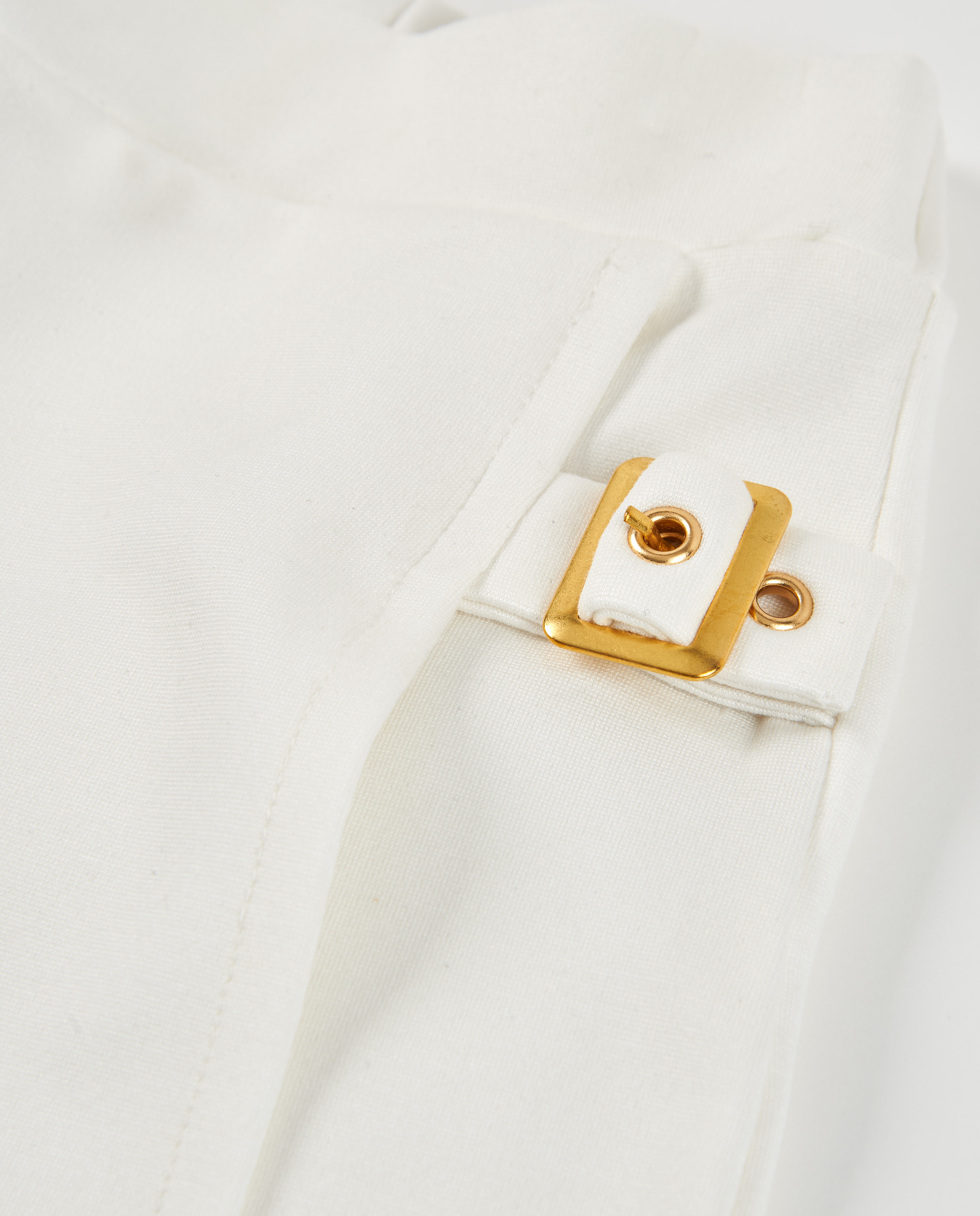 Αναβαθμίστε την γκαρνταρόμπα της μικρής σας με αυτή την κομψή λευκή φούστα-σορτς. Σε κλασική γραμμή Α, διαθέτει διακοσμητική χρυσή αγκράφα στο πλάι που προσθέτει μια δόση πολυτέλειας. Συνδυάζει την κομψότητα μιας μίνι φούστας με την πρακτικότητα ενός σορτς. Το ανάγλυφο ύφασμά του και η εντυπωσιακή αγκράφα το καθιστούν ιδανικό τόσο για casual εμφανίσεις με t-shirt, όσο και για πιο επίσημες στιγμές με ένα πουκάμισο.