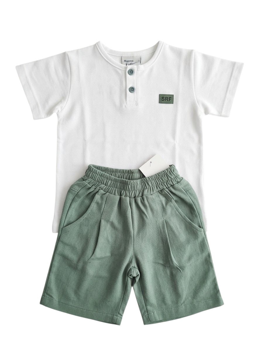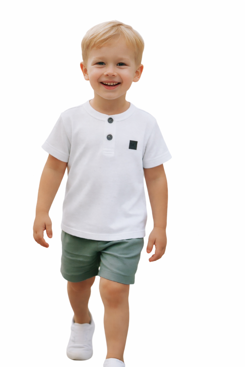 Παιδικό σετ καλοκαιρινής ένδυσης που συνδυάζει άνεση και στυλ για καθημερινές εμφανίσεις. Το λευκό κοντομάνικο μπλουζάκι διαθέτει διακριτικά κουμπιά στο στήθος και minimal λεπτομέρεια, προσφέροντας καθαρή και κομψή αισθητική. Το πράσινο σορτσάκι συμπληρώνει ιδανικά το σύνολο, με άνετη εφαρμογή που επιτρέπει ελευθερία κινήσεων όλη μέρα.