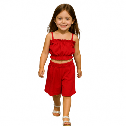 Χαρίστε στη μικρή σας πρωταγωνίστρια μια εμφάνιση γεμάτη ζωντάνια και άνεση με αυτό το υπέροχο καλοκαιρινό σετ σε έντονο κόκκινο χρώμα. Σχεδιασμένο για να προσφέρει ελευθερία κινήσεων χωρίς να θυσιάζει το στυλ, είναι η ιδανική επιλογή για τις βόλτες και τις διακοπές.
