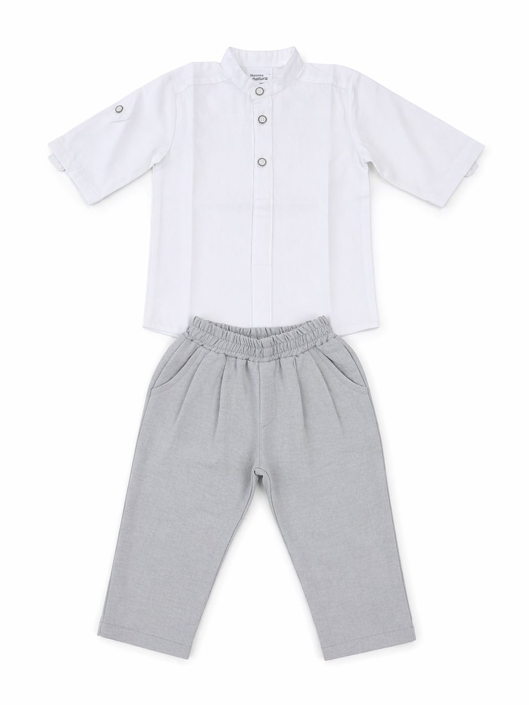 - Πουκάμισο: Λευκό πουκάμισο με γιακά τύπου μάο (stand-up collar) και κοντά μανίκια με ρεβέρ, προσφέροντας έναν καθαρό και μοντέρνο αέρα.