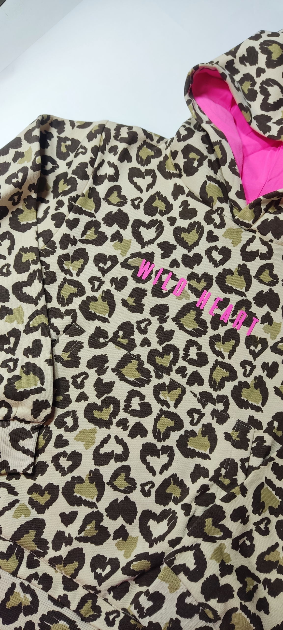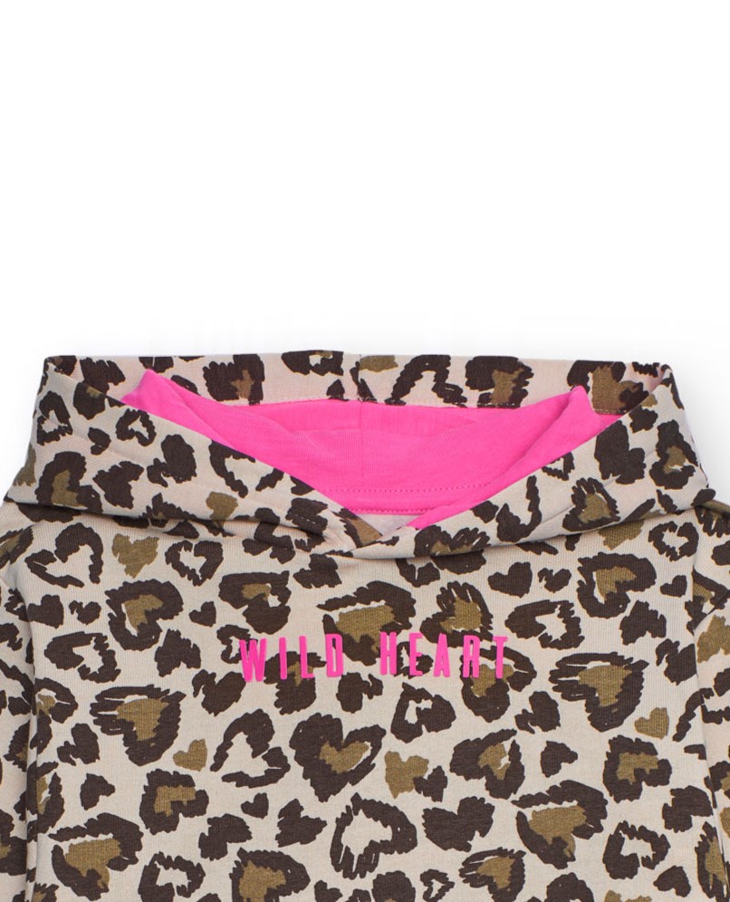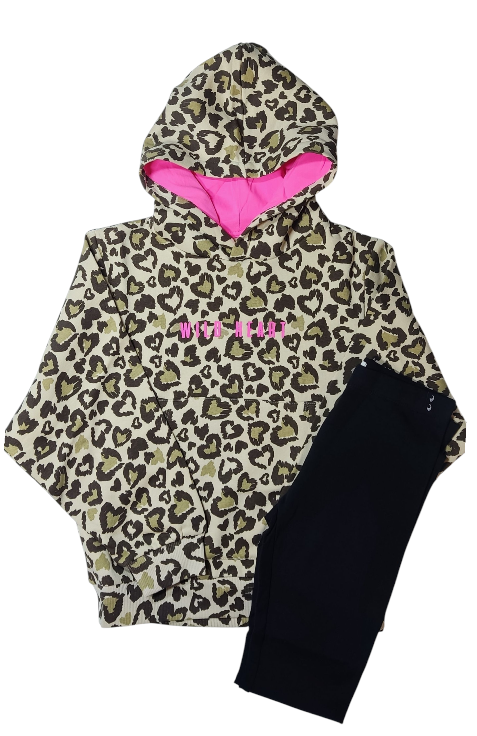 Set Cheetah φούτερ με κουκούλα και τσέπες μπροστά μπεζ σχέδιο καρδιές και μαύρο κολάν.