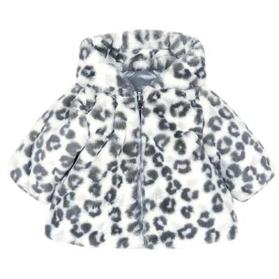 Μπουφάν Chicco κοριτσίστικο διπλής όψης με κουκούλα. Η εξωτερική όψη είναι ασημί ενώ η εσωτερική γούνα μπεζ με μαύρα σχέδια.