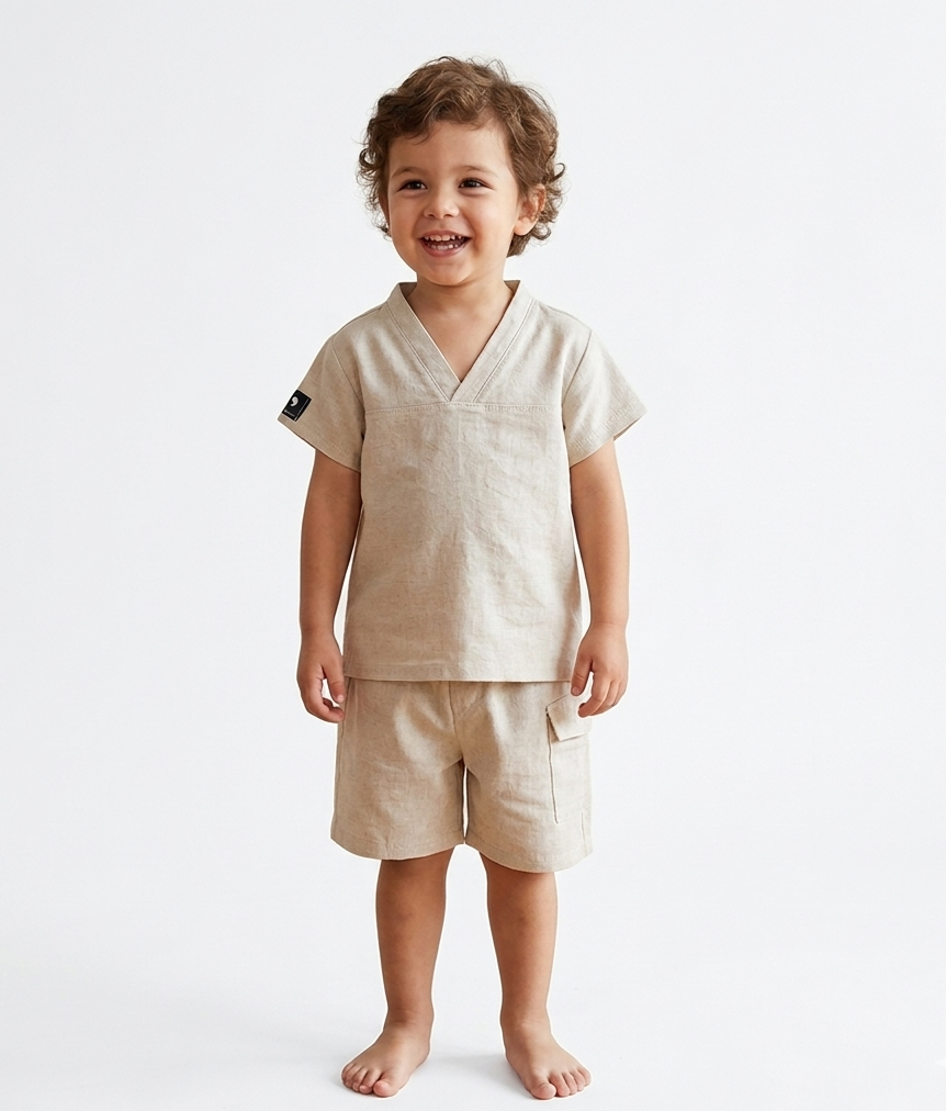 Ένα καλοκαιρινό παιδικό σετ δύο τεμαχίων σε minimal, γήινη αισθητική, ιδανικό για προσεγμένες αλλά άνετες εμφανίσεις.