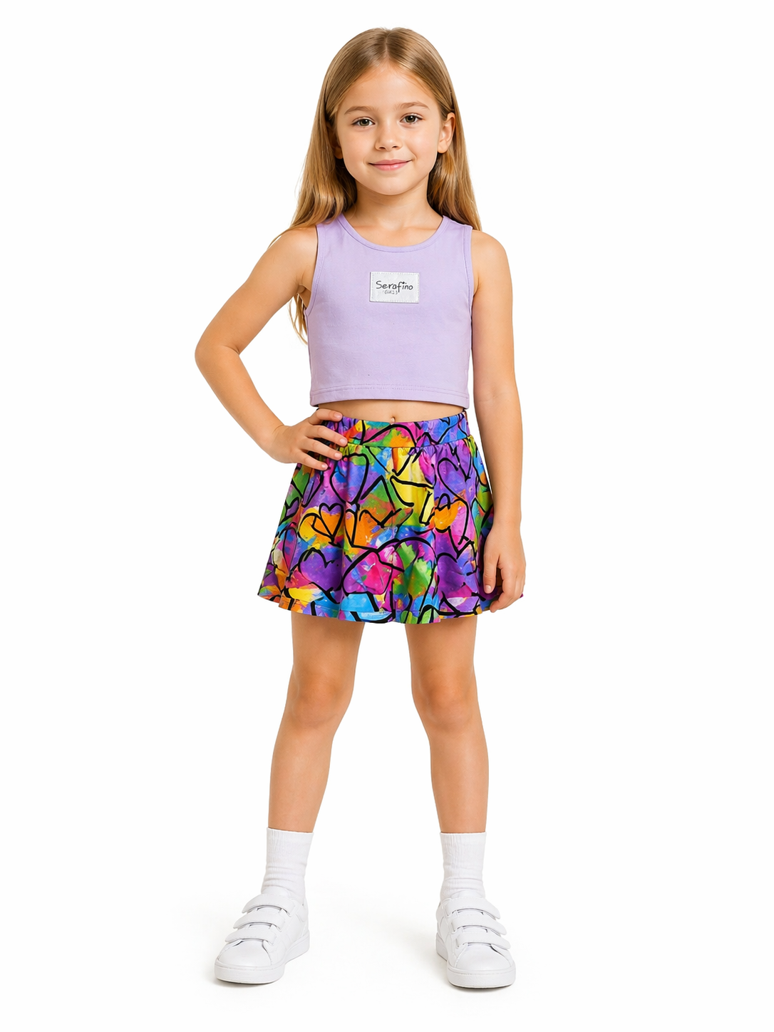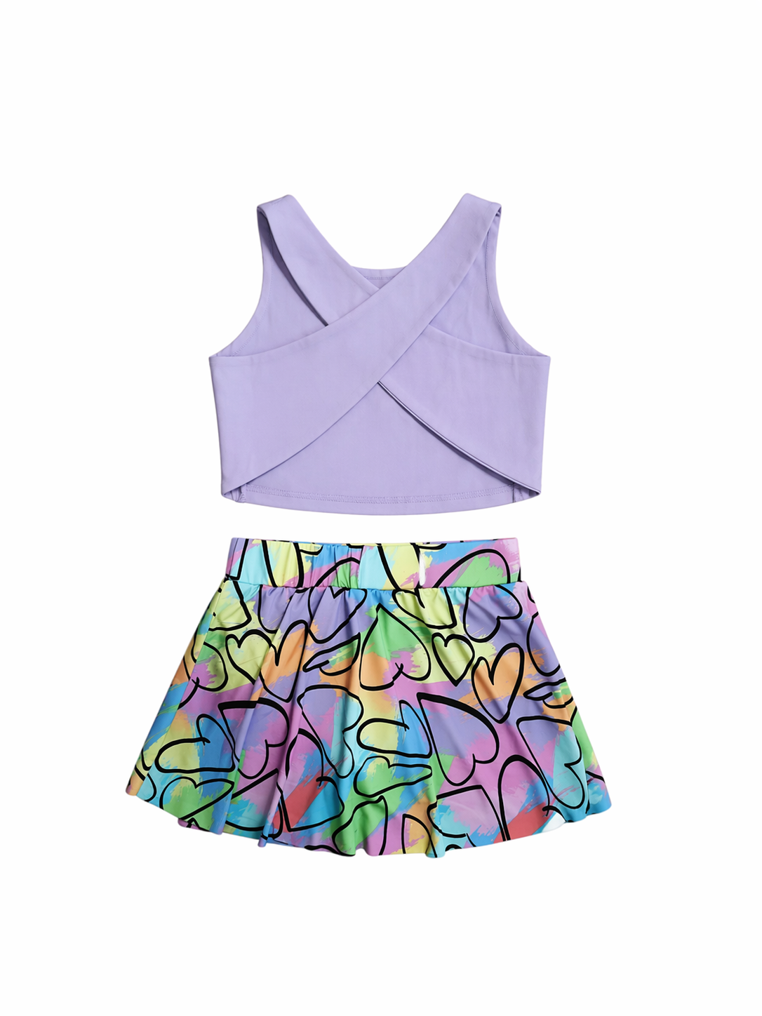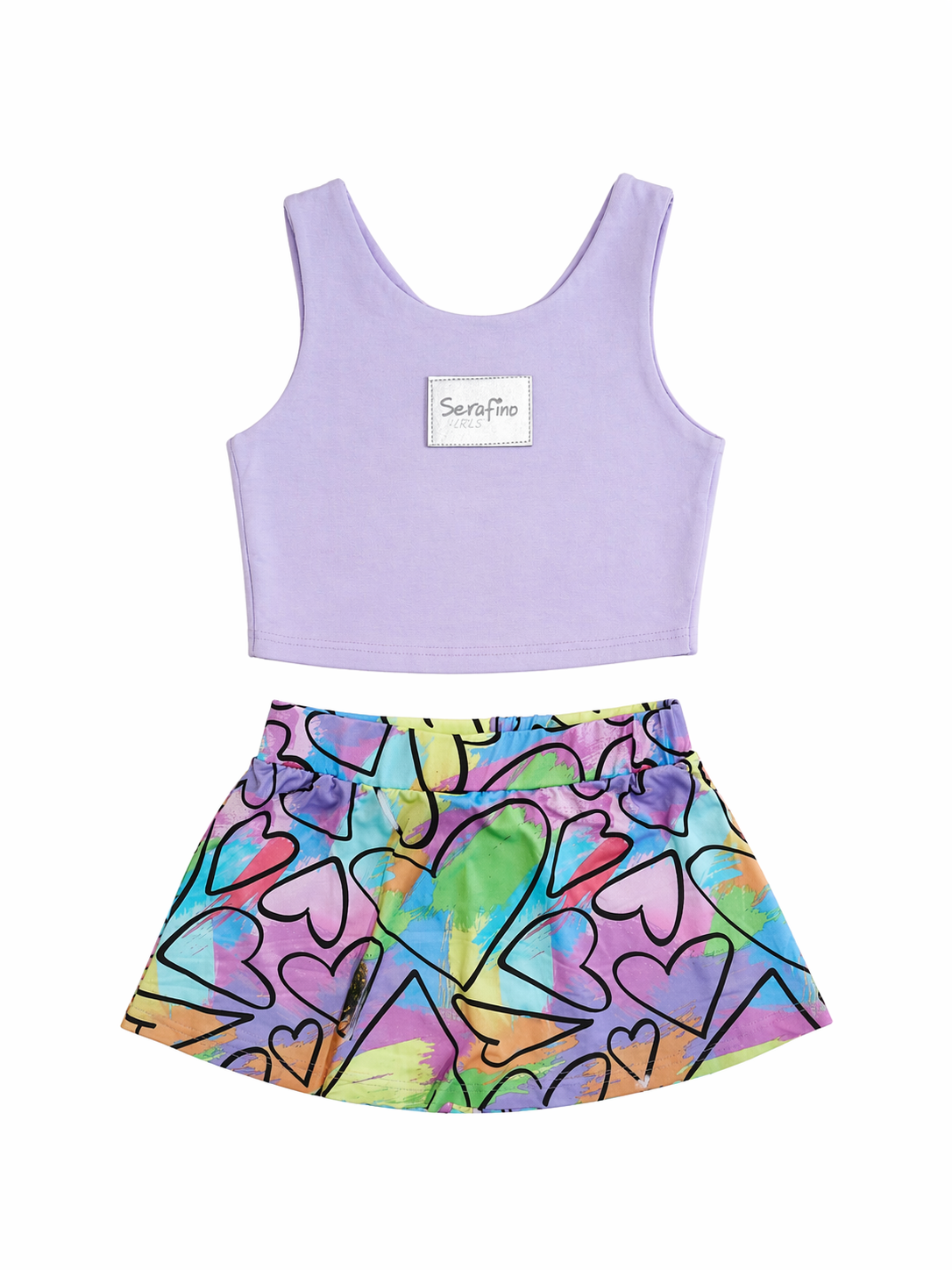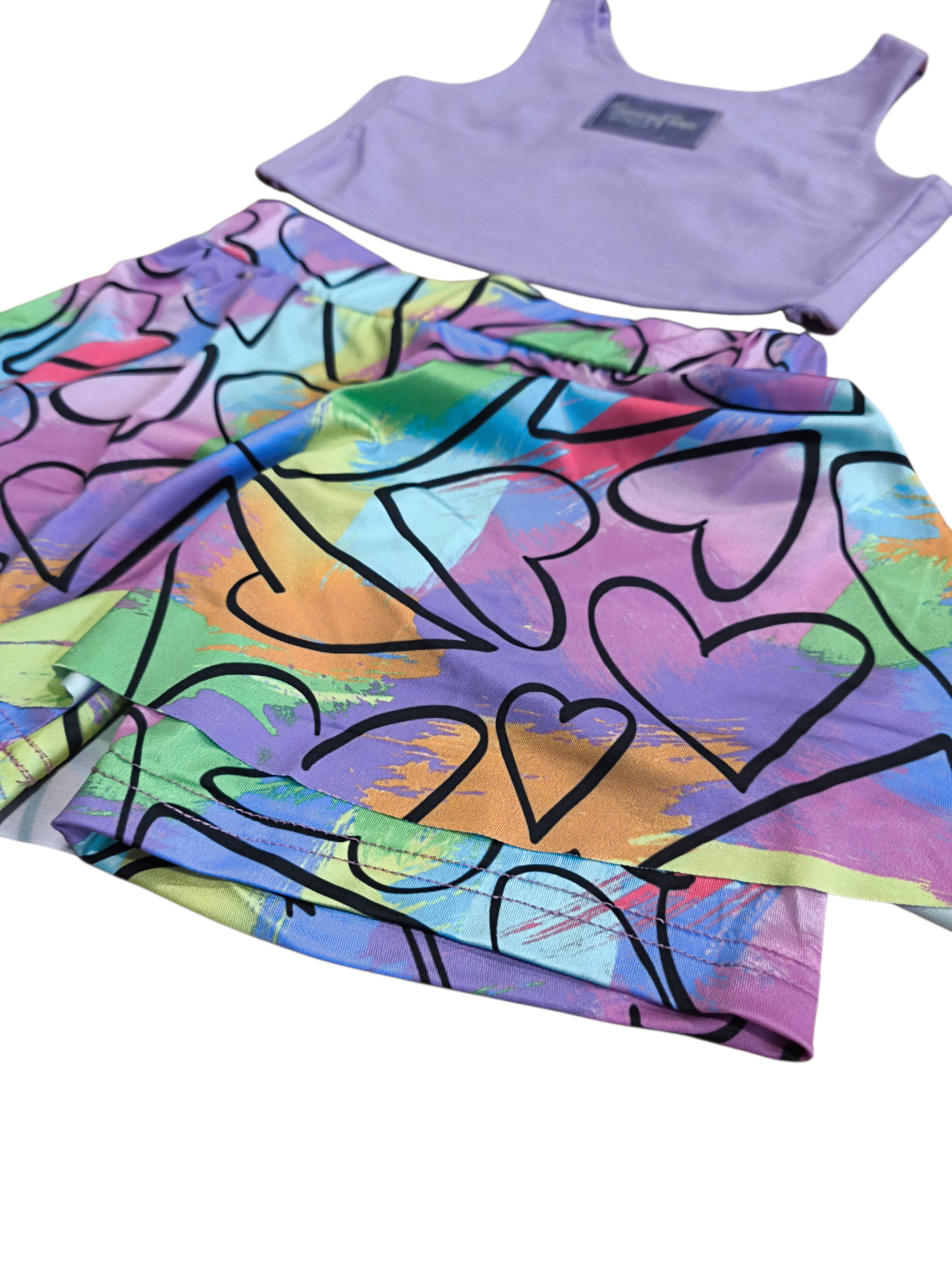 Σετ καλοκαιρινό παιδικό με μοντέρνο και χαρούμενο design. Περιλαμβάνει κοντό τοπ σε απαλή λιλά απόχρωση και ασορτί φούστα – σορτσάκι με πολύχρωμο μοτίβο και σχέδια καρδιές που προσθέτουν παιχνιδιάρικη διάθεση. Κατασκευασμένο από ελαφρύ και άνετο ύφασμα, ιδανικό για τις ζεστές ημέρες. Η ελαστική μέση στο σορτσάκι εξασφαλίζει άψογη εφαρμογή και ελευθερία κινήσεων. Ιδανική επιλογή για καθημερινές εμφανίσεις με στυλ και άνεση.