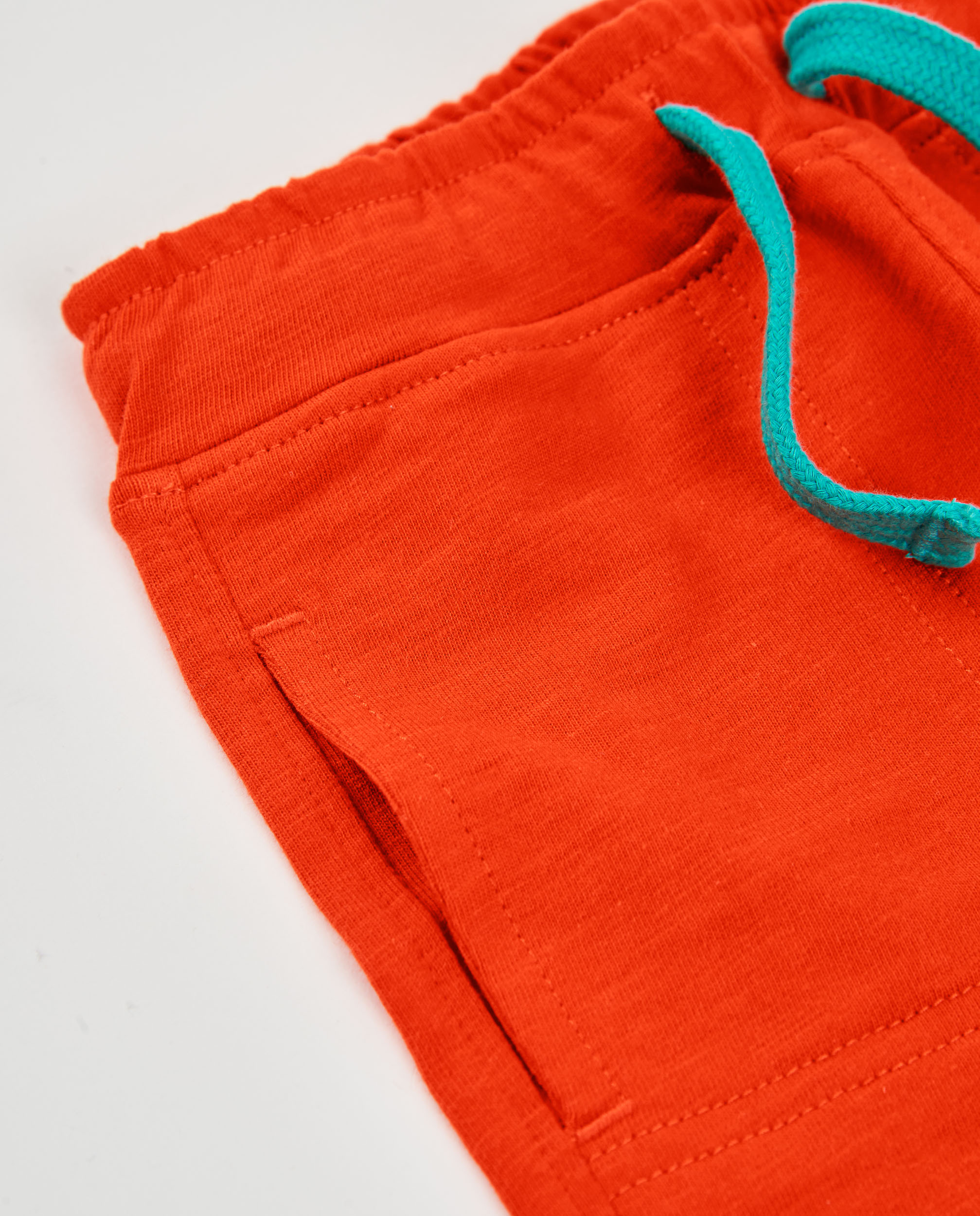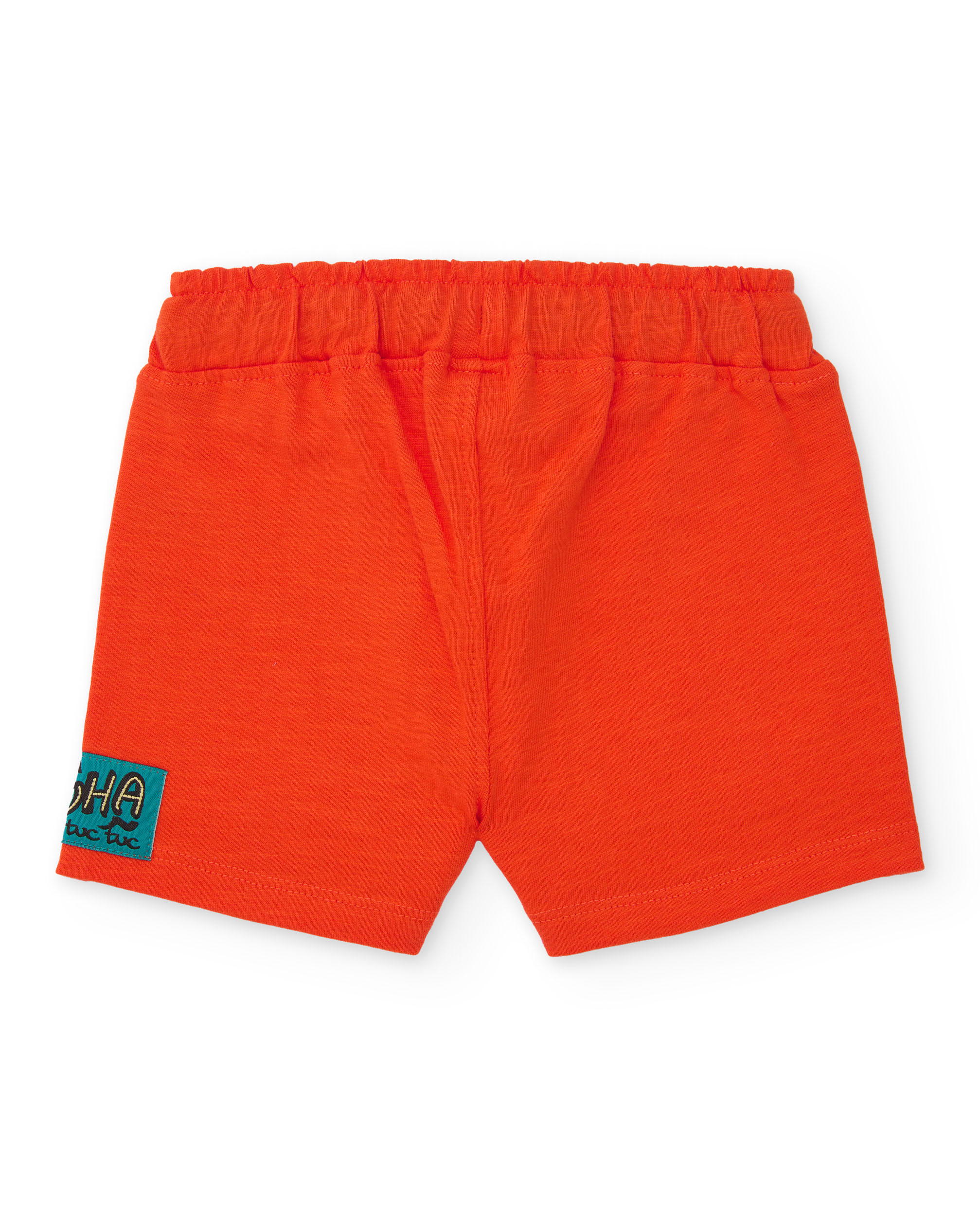 Σορτς: Σε έντονο πορτοκαλί χρώμα με ανάγλυφη υφή (slub cotton). Διαθέτει ελαστική μέση με διακοσμητικό κορδόνι σε αντίθεση και διακριτικό σήμα “Aloha” στο πλάι.